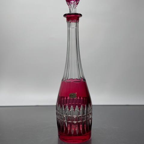 Bemærk venligst, at proppen ikke er original til karaffen og viser synlige tegn på tidens gang, samtidig med at den passer godt og forbliver fuldt funktionel. Disse elementer er omhyggeligt afspejlet i fotografierne, som udgør en integreret del af beskrivelsen.