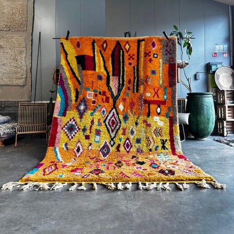 Boujad-tæpper er kendt for deres udtryksfulde farver, symbolske motiver og kunstneriske frihed. Dette stykke præsenterer en varm og harmonisk palette af koral-rosa, terracotta, blød gul, sort og subtile lilla accenter, arrangeret i en rig geometrisk komposition. Den naturligt ældede uld har udviklet en smuk patina, samtidig med at den forbliver blød, tæt og holdbar.