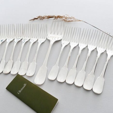Smukt sæt bestik fra Christofle, Cluny-modellen, 127 dele. Fuldt og elegant sæt, sølvbelagt, hver del med producentmærket. Cluny-modellen er værdsat for sin enkle og tidløse elegance: afbalancerede linjer, fransk klassisk stil og en diskret, men prestigefyldt tilstedeværelse på bordet. Et ideelt sæt for dem, der ønsker Christofle-kvalitet og et alsidigt service, perfekt til både vigtige lejligheder og en daglig bordopstilling i høj kvalitet.
