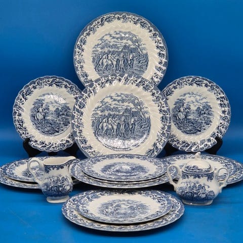 Servicen er udført i blåt transfertryk og viser detaljerede engelske landskabsscener med ryttere, landskaber og florale bånd.