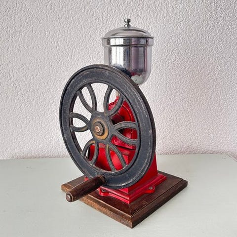 Et stort kaffekværn med et kraftfuldt udseende, meget dekorativt og samlerobjekt, ideelt for entusiaster af kaffehistorie, antikke køkkengenstande eller landlige og industrielle interiører.