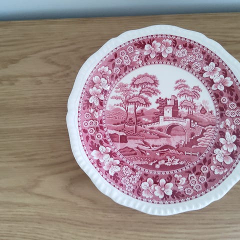 Servicen er dekoreret med et detaljeret rødt transfertryk og viser et idyllisk landskab med tårn, bro og træer.