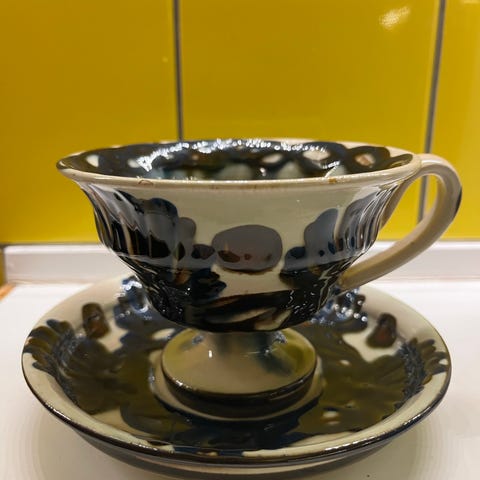 Kähler te kop med underkop. Flot matsort overflade og karakteristisk hank.Rigtig god stand. Har i alt 4 sæt. Pris pr sæt.