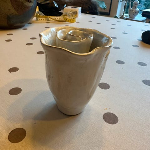 Super smuk gammel vase. Har lidt patina og skader på roserne - men man ser dem ikke ret godt pga. det rustikke look. Der er et mærke eller har siddet i klistermærke i bunden, som jeg ikke kan tyde, så ved ikke hvor den er fra? Smuk er den🫶🏻