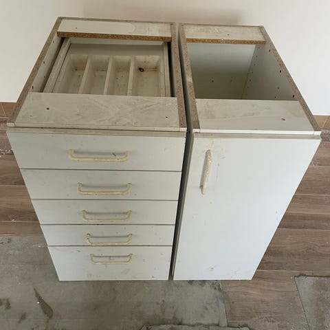 Hvide vægskabe. Fronter og indre er i fin stand. Mærker og rester af lim mm på siderne. Er ikke forsøgt fjernet.