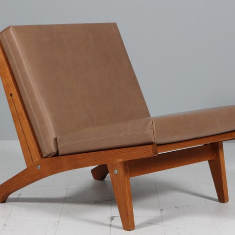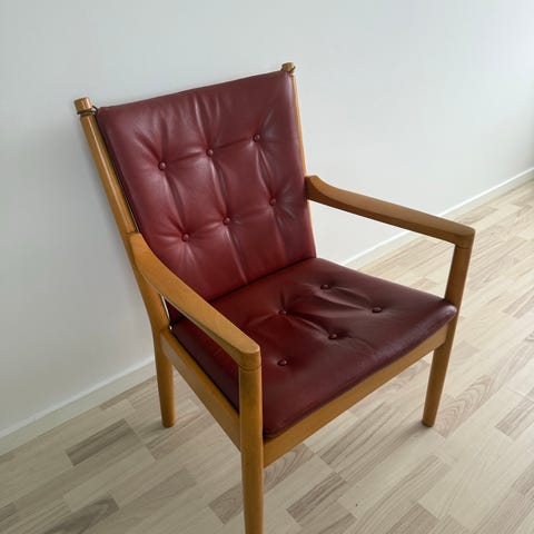 Carl Hansen Hans J Wegner lænestol i rød læder med metalben. Designet af Hans J Wegner, stolen har et karakteristisk højt ryglæn og armlæn, velegnet til opholdsområder.