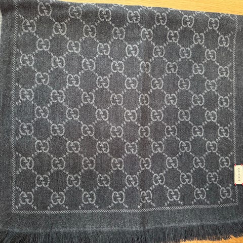 Gucci tørklæde virkelig fint, smukt, i blå/ Gucci farve . Designet til sjal/ kappe. størrelse XL. Måler 130+130. Tørklædet har et mønstret design og leveres med original emballage.