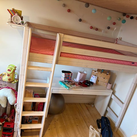 Flexa seng . Benene kan forhøjes ,så den bliver 53.5 cm højere end normal højde 67cm...der medfølger stige og madras