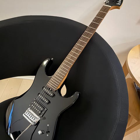 Fik den her fætter med i en handel. Ved ikke helt hvad jeg skal mene om formen. Men om ikke andet, er der mange gode dele i den f.eks en lækker hals, bro, messing nut og fede Wilkinson pick upper. Output jack, og volumepot sidder løst. Kan spille men skratter lidt. Skal lige fikses.
