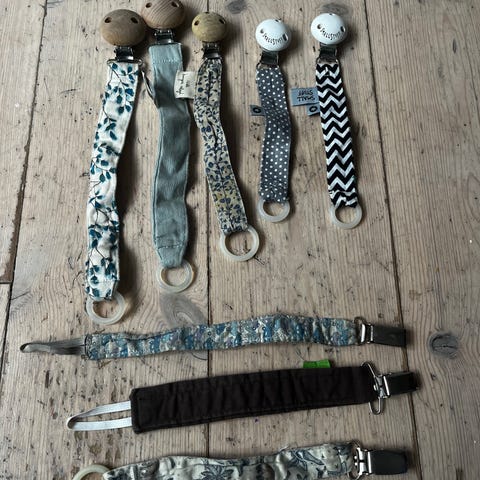 MAM suttesnore til børn i forskellige farver og designs. Hver suttesnor har en plastclips til fastgørelse og en ring til sutten. Materialet er tekstil og plastik.