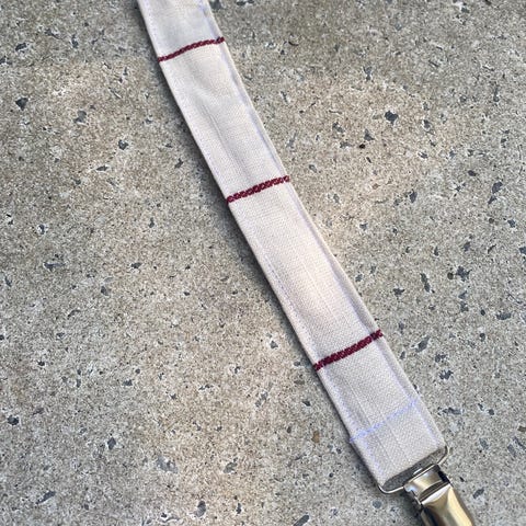 Sættet indeholder forskellige suttesnore og sutter med mønstre i farver som blå, hvid, sort og beige. Materialerne omfatter stof og træ. Produkterne er designet til spædbørn og småbørn og kan bruges til at holde sutten ren og inden for rækkevidde.