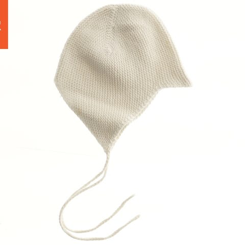 babyHue strikket i gråt uldgarn med fletmønster design. Huen har bånd til fastgørelse.