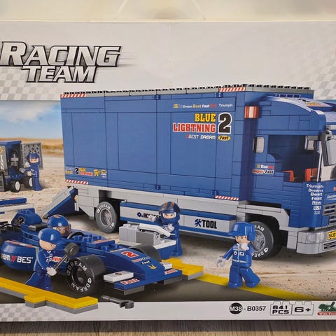 Et byggesæt med klodser i 741 dele! Når du har bygget færdig har du en F1 racerbil, værksted med mange detaljer samt en mindre golfbil. Der er tydelige instruktioner samt klistermærker inkluderet.