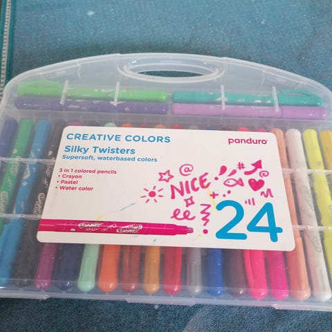Panduro Silky Twisters er et sæt med 12 farveblyanter, der tilbyder tre i én funktion: farveblyant, pastel og vandfarver.