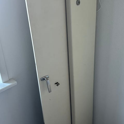 FG433 Model HP07 våbenskab til opbevaring af 7 våben. Skabet er fremstillet i hvidlakeret stål og har lås med nøgle. Designet til sikker opbevaring af våben. Hertil separat rum med lås til ammunition. Pænt og absolut i orden. Sælges alene grundet køb af større våbenskab. Mål H:145 cm. B:35 cm. D:30 cm.