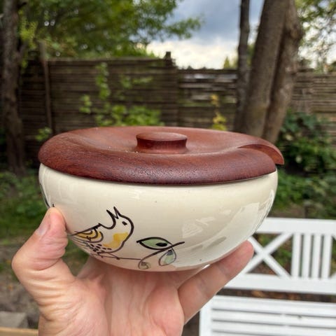 Retro krukke med låg, Flot retro krukke med låg/tobaksdåse i teak. Mål: 14xØ10 cm. Til salg 145 kr. Vi sender gerne forsvarligt pakket sporbar forsendelse .