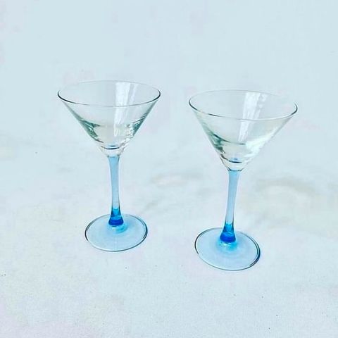Smukke franske cocktailglas eller dessertskåle med koboltblå fod. De er i flot stand. Mål: H: 9 cm. Ø: 10 cm.