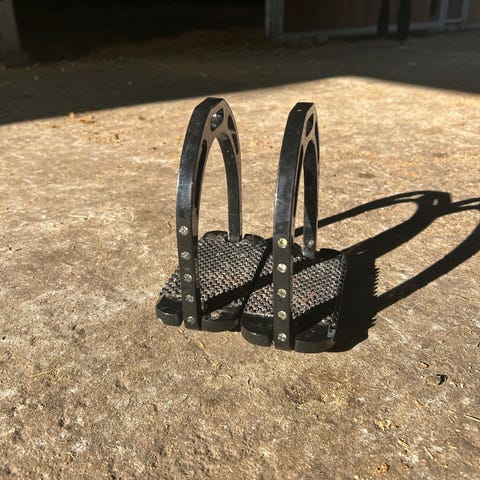 Stigbøjler i metal med skridsikre trin, velegnet til ridning. Designet til at give stabilitet og sikkerhed under ridning.