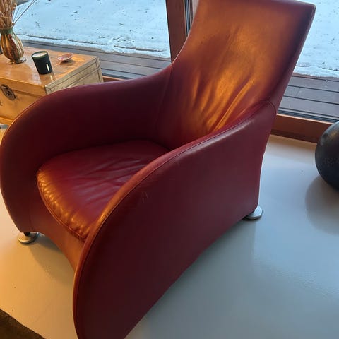 Montis Loge er et studio i svungne former. Loge er inspireret at klassiske biler og formen indbyder til man læner sig tilbage og tager en slapper. Det dybe sæde er især passende til høje mennesker og man sidder relativt lavt i stolen. Den har et par år på bagen, men den er i god stand.