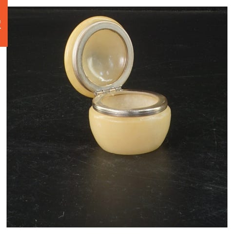 Et lille dekorativt skrin med mønster. Skrinet er lavet af forskellige materialer og har en messinglås foran. Målene er 6x4,5x3,5 cm. Skrinet har et unikt mønster med grøn, hvid og violette nuancer. Indersiden er sort og viser tegn på brug.