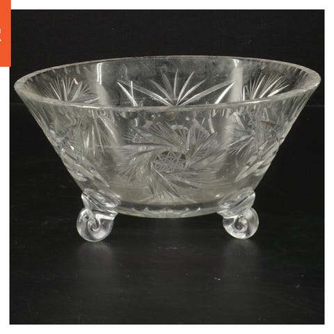 Skålen er lavet af glas og har et diameter på 18 cm. Den har et skåret dekorativt mønster med blomster og geometriske former omkring skålens sider. Mønstret tilføjer et klassisk, æstetisk look til skålen. Skålens overflade er klar, og mønstrene er hvide lidt frosted.
