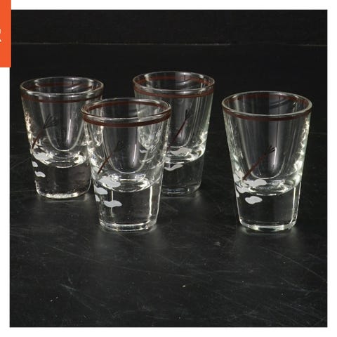 Dette er et sæt af fire klare glas, hver med en højde på 14 cm. Glassene har en traditionel stil med en bred, stabil fod og en balanceret form, der er ideel til servering af drikkevarer. Der er lidt dekorative detaljer, som kan ses på et af glassene.