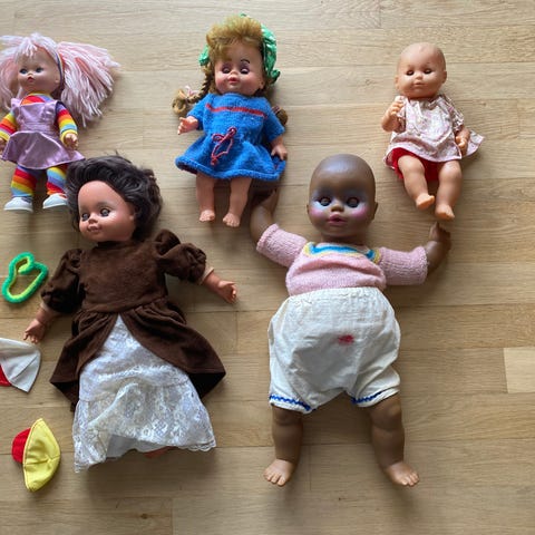 Billederne viser en samling af gamle dukke dele, der inkluderer torsos, lemmer og hoveder. To af dukkerne bærer delvist tøj, en med strikket trusse og den anden i en hvid ble. Der ser ud til at være slid på overfladerne og tøjstoffet er delvist lappet. Håret på en af dukkerne ser ud til at være lavet af syntetisk materiale eller uld.