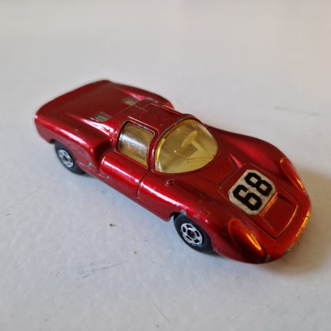 En rød modelbil, der repræsenterer en Porsche 911, med dimensionerne 54x20,5 cm. Bilen er lavet af plastik og har sorte hjul med et realistisk design. Den har en åben kabine med to sæder og en klar forrude. Porsche logoet er synligt på fronten af bilen. Modellen har også gule forlygter.