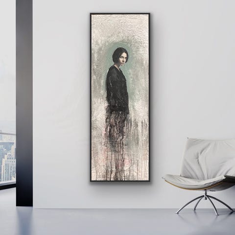 Maleri med abstrakt motiv af en figur i mørke og lyse farver. Langstrakt format med en kombination af brune, sorte og hvide nuancer. Velegnet til vægophæng som dekorativt element.