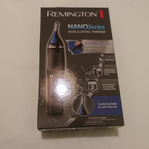 (Ny / fejlkøb) Dette er en Remington næsetrimmer, som kommer med flere beslag/guides til forskellige trimningsopgaver. Den er lavet af sort plastik med gulddetaljer. Trimmeren er batteridrevet og leveres med en batteri og opbevaringspose.