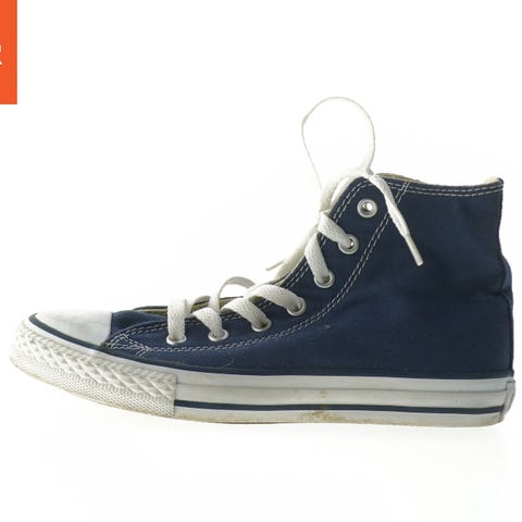 Et par beige Converse All Star sneakers i størrelse 36. Disse klassiske sko har højt skaft og snørebånd. De har en gummisål og randsyning i rød og sort. Et ikonisk 'All Star' mærke er på hælen.
