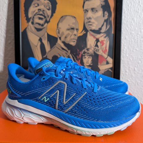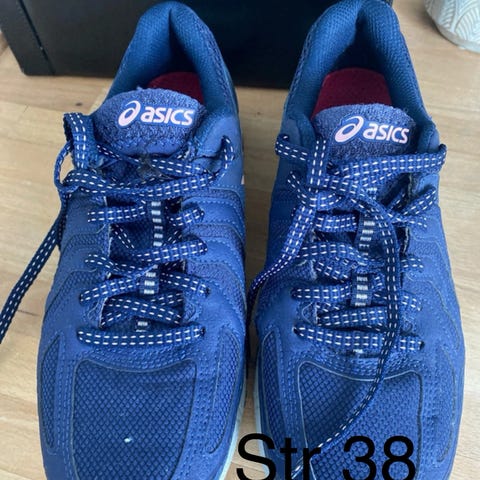 Et par løbesko til kvinder med størrelse 40. Skoene har et mesh-design for åndbarhed og snørebånd for justerbar pasform. De er primært mørkeblå med kontrastdetaljer i rød og hvid på sålen. De har en letvægtskonstruktion med en slidstærk gummisål for godt greb.