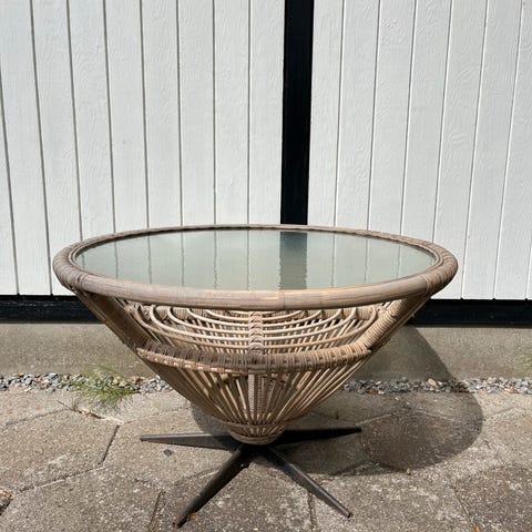 IN-OUT sofabord med rund glasplade og sort fletmateriale. Bordet er designet til både indendørs og udendørs brug og har en robust konstruktion.