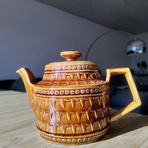 Denne vintage tekande er lavet af messing og har et klassisk design. Tekanden har en rund form med en diameter på 18 cm og en højde på 13 cm. Den har et buet tud og et robust håndtag for nem hældning. Messingen giver den en gylden farvetone og en tidløs æstetik. Den er ideel til dekoration eller som en samlergenstand.