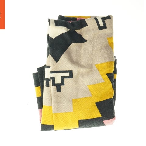 Et strikket tæppe, der måler 70x180 cm. Tæppet har et farverigt stribet mønster i nuancer af gul, rød, blå og grå. Kanterne er afsluttet med frynser, der giver et klassisk udseende.