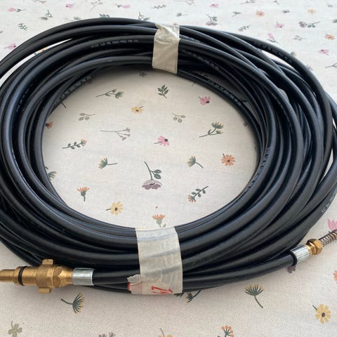 En metalspiral, der bruges som kloakrenserslange. Den har et rødt håndtag i den ene ende for bedre greb. Produktet er pakket sammen med en etiket, der viser mærket 'MAX'.