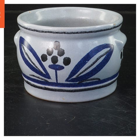 Skålen har en diameter på 5,5 cm og er lavet af keramik eller porcelæn. Ydersiden er primært hvid, mens indersiden har et design med blå og brune mønstre. Basen af skålen viser, hvad der ligner tegn eller skrift karakter, som muligvis indikerer producent eller design. Skålen er lille og har primært en dekorativ funktion.
