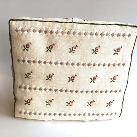 Tehætte, håndlavet med applikation og broderi (h 27 cm, omkr. 68 cm)