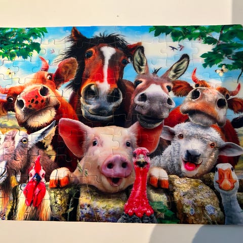 Dette er et træpuslespil, der indeholder figurer af bondegårdsdyr som en hest, en ko, en gris og en får. De individuelle figurer kan placeres i de tilsvarende former på spilbrættet. Det er egnet til små børn og kan hjælpe med at udvikle deres motoriske færdigheder samt genkendelse af former og dyr.