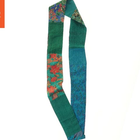 Tørklæde med bladmønster i forskellige nuancer af grønne og røde farver på en lys baggrund. Tørklædet måler 85x85 cm og har et dekorativt design med blade og blomster. Bladmønsteret virker inspireret af naturlige temaer, hvilket giver tørklædet et unikt og stilfuldt udseende. Det kan bruges som modetilbehør eller som et dekorativt element i hjemmet. Tørklædet er let og kan foldes eller draperes på forskellige måder.
