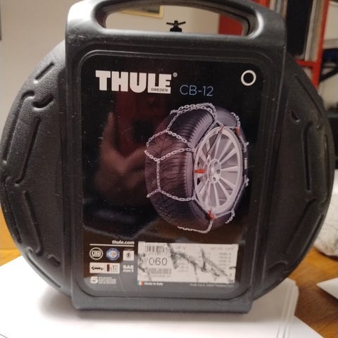 Thule snekæder model CB-12, som er designet til personbiler for at øge vejgrebet på sne- og isdækkede veje. Pakken indeholder en solid opbevaringskasse. Disse snekæder er nemme at montere og løsne. De er fremstillet af holdbart materiale og passer til flere dækstørrelser, hvilket ses specificeret på emballagen.