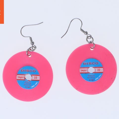 Et par unikke øreringe, der er formet som små vinylplader i en lys orange farve. Hver ørering har en diameter på 40 mm og viser en etiket med ordet 'DISCO' sammen med andre dekorative elementer. Øreringene har en metalkrog, der gør dem lette at hænge i øret.