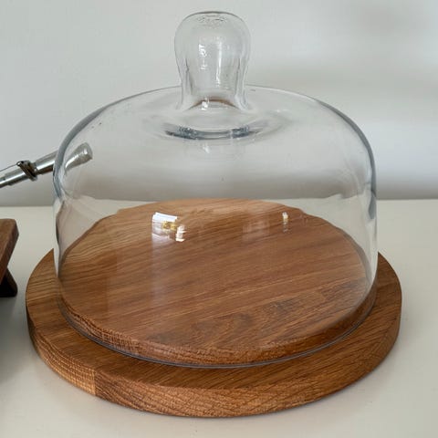 Dette er en Teak træ skål med glasindsats med glas låg. Glasskålen og træbasen passer sammen og fungerer som en opbevaringsenhed til ost, smør eller andre lignende varer. Størrelsen på objektet er Ø 18x10 cm. Tags: ost, låg, opbevaring, teak, træ, glas.
