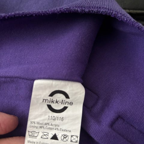 Købt i Ønskebørn. Str,122-128. Aldrig været i brug. Bomuld indvendig og uld udvendig. I den lilla står der navn inden i.25kr stykket.