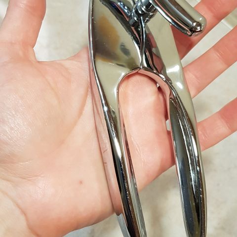 En dåseåbner lavet af rustfrit stål med sort plast håndtag. Den har en drejelig knap til at åbne dåser nemt. Dåseåbneren er 19 cm lang og har en ring til ophængning i enden.