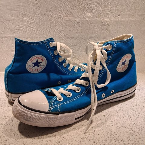 Par af Converse All Star sneakers i blå farve. Skoene er i størrelse 35 og har den klassiske høje snøre design med en hvid snude og sål. De har det ikoniske All Star logo på bagsiden og siden af skoen. Skoenes såler viser synlige tegn på brug med noget snavs og slid.