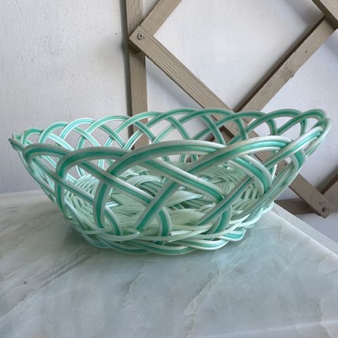 Ovnfast, ovalt keramikfad med retro grøn glasur og tilhørende serveringskurv i flet.