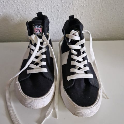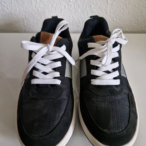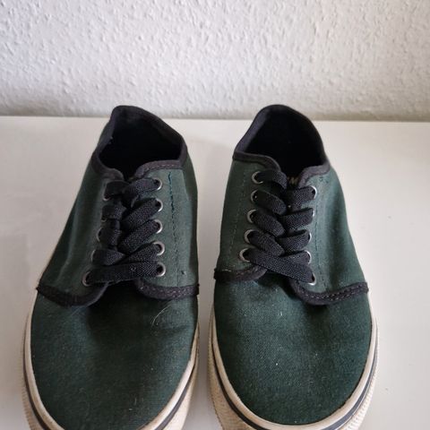 Et par hvide sneakers til børn i størrelse 26. Skoene har velcro lukning og snørebånd for ekstra sikkerhed. De har en robust sål som giver god støtte. Skoene har et slidt udseende med nogle pletter og snavs på både overdel og såler, hvilket viser tegn på brug.