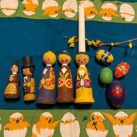 Fem påske ting i træ sælges samlet for 150 kr. Lille forårspige fra Mogen Eigenbrod, fin stand.