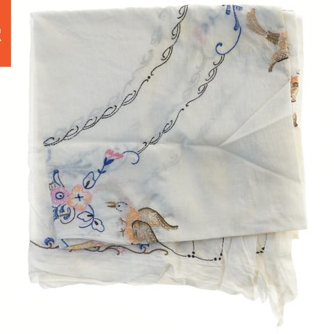 broderedt dug med dekorative blomstermotiver og hvide kniplinger langs kanterne. Dugen måler 52x37 cm og har en symmetrisk mønster i midten med lilla detaljer.